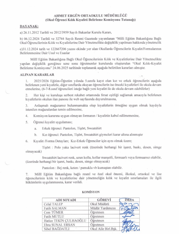 2025/2026 Egitim-Ögretim yılında 5.sınıfa kayıt olan kız ve erkek ögrencilerin belirlenen yeni kıyafetle, diger sınıflarda okuyan ögrencilerin ise önceki kıyafetleri ile okula devam  etmelerine karar verilmiştir. (6-7-8.sınıf ögrencileri istege bağlı yeni kıyafet ile de okula devam edebilirler)